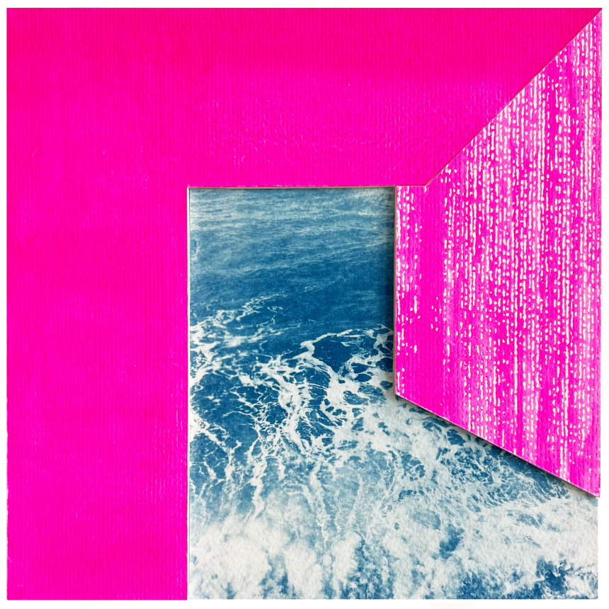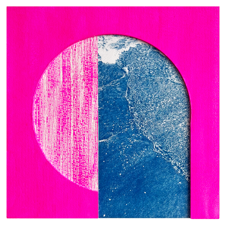 20 x 12 cm Cyanotype on watercolor paper, acrylic paints, print on film, masonite board, rear wooden frame 2024
